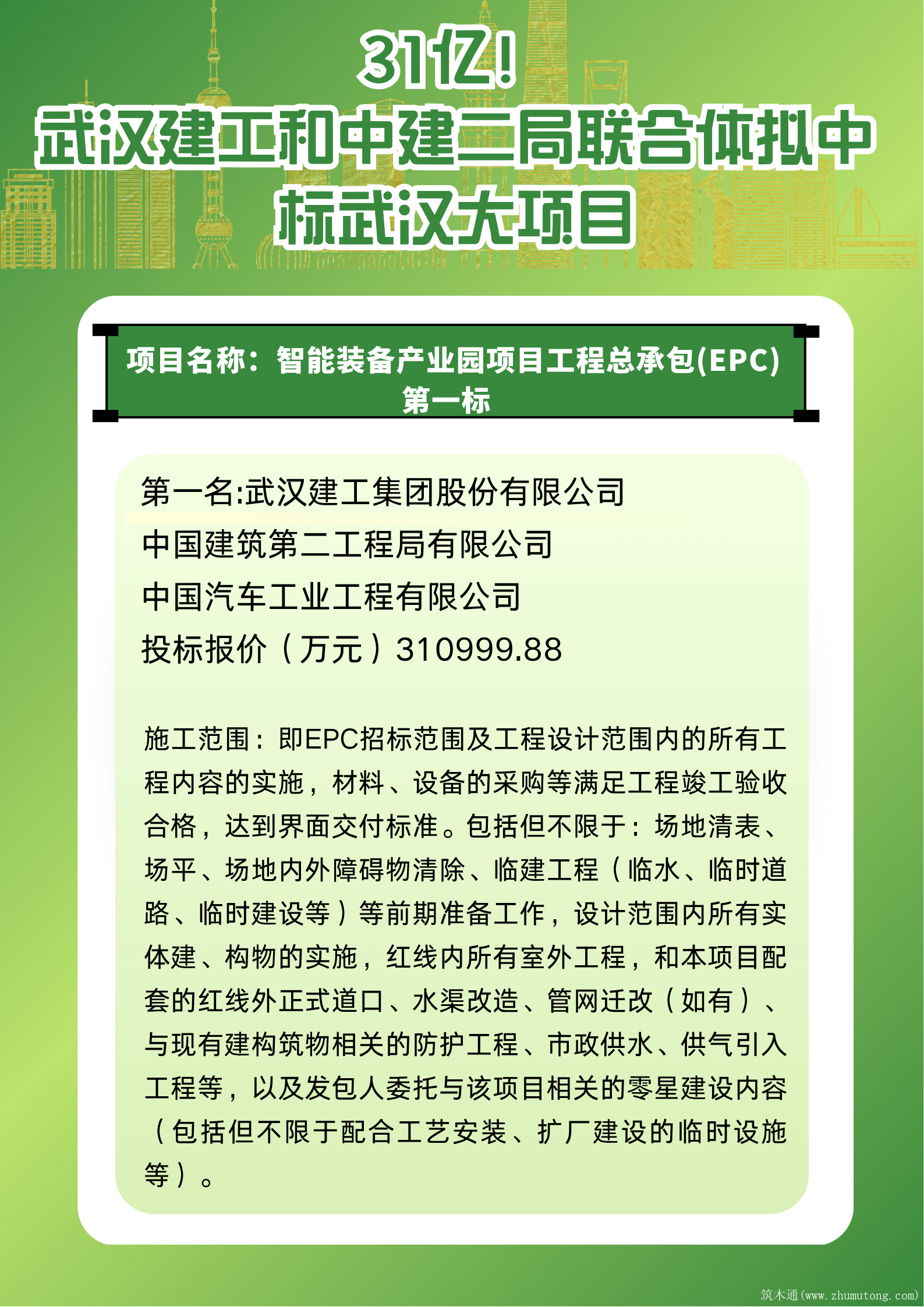 近日,武汉建工和中建二局联合体拟中标武汉大项目,超30亿!小编将详细中标信息整理成图表形式,便于各位同行们迅速查看。