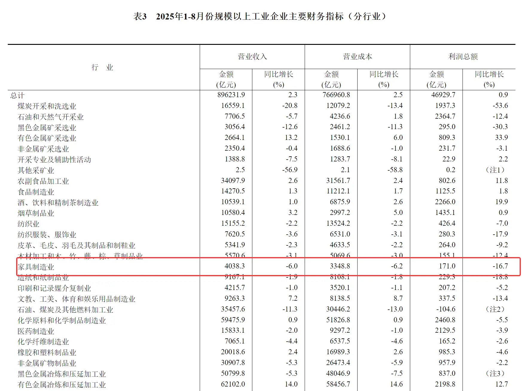 9月27日,国家统计局发布2025年1-8月全国规模以上工业企业利润数据显示,与整体工业利润由降转增的积极态势相比,家具制造业承压明显。