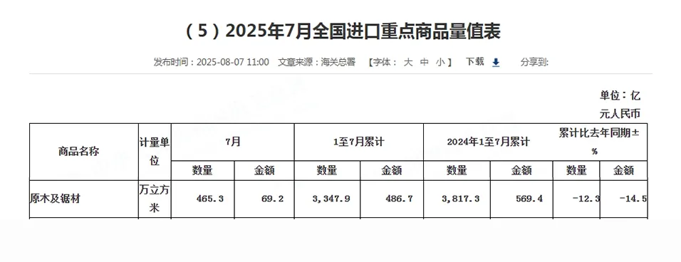 整体上看,2025年1至7月,中国累计进口原木和锯材共3347.9万立方米,对比2024年同期的3817.3万立方米下降了12.3%,进口减少469.4万立方。前7个月原木和锯材进口金额累计达到486.7亿元,同比下降14.5%。 整体上看,2025年1至7月,中国累计进口原木和锯材共3347.9万立方米,对比2024年同期的3817.3万立方米下降了12.3%,进口减少469.4万立方。前7个月原木和锯材进口金额累计达到486.7亿元,同比下降14.5%。