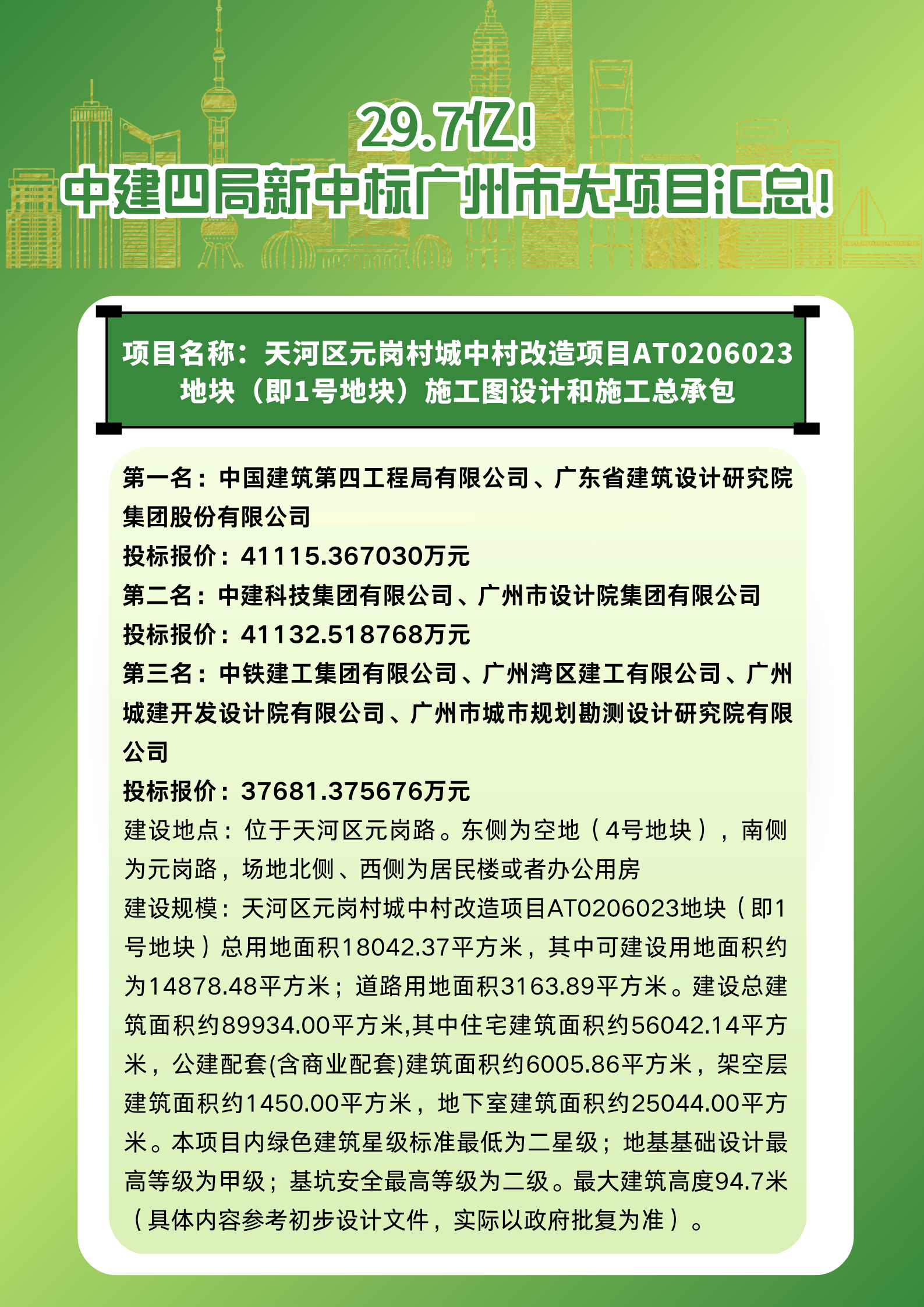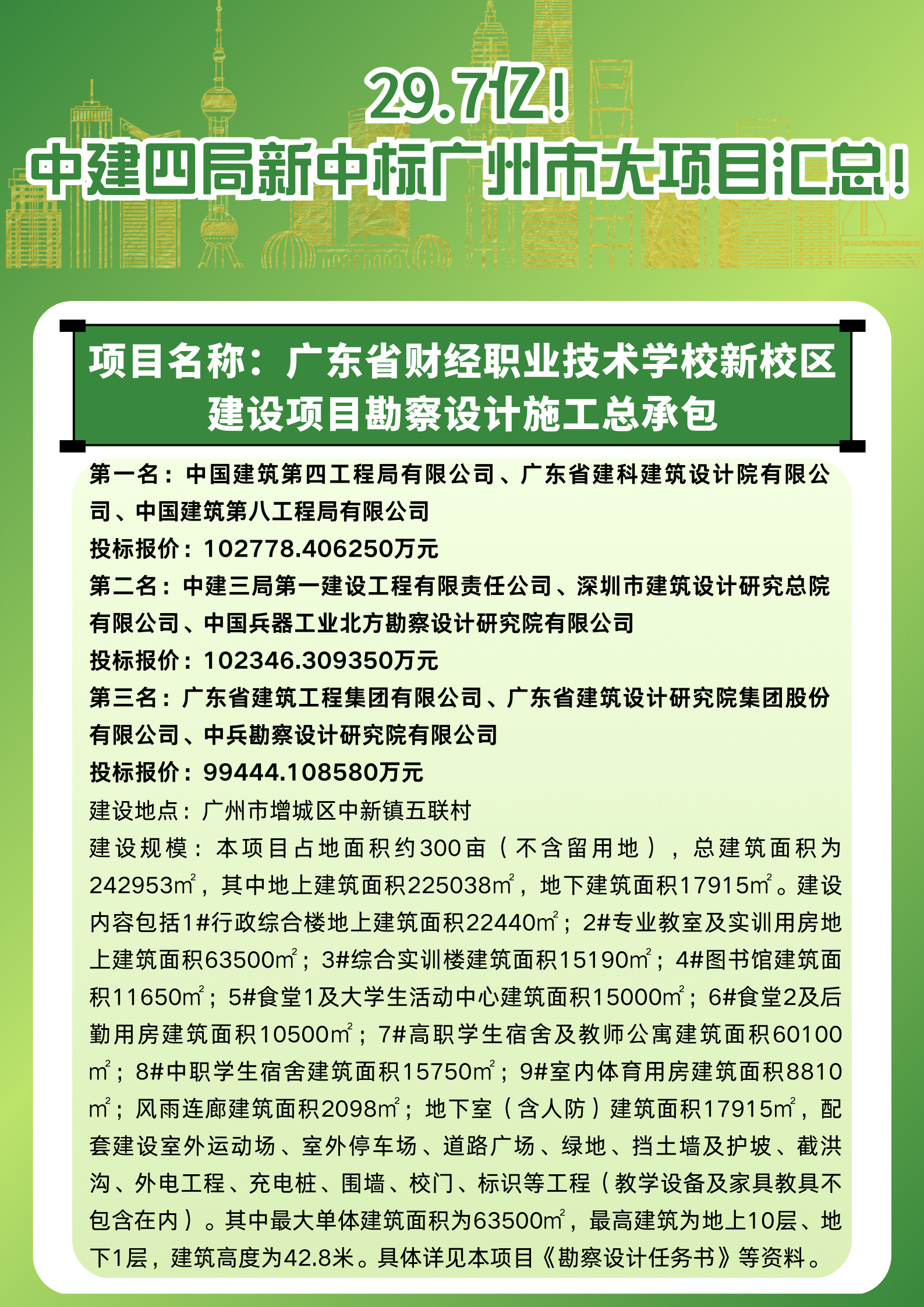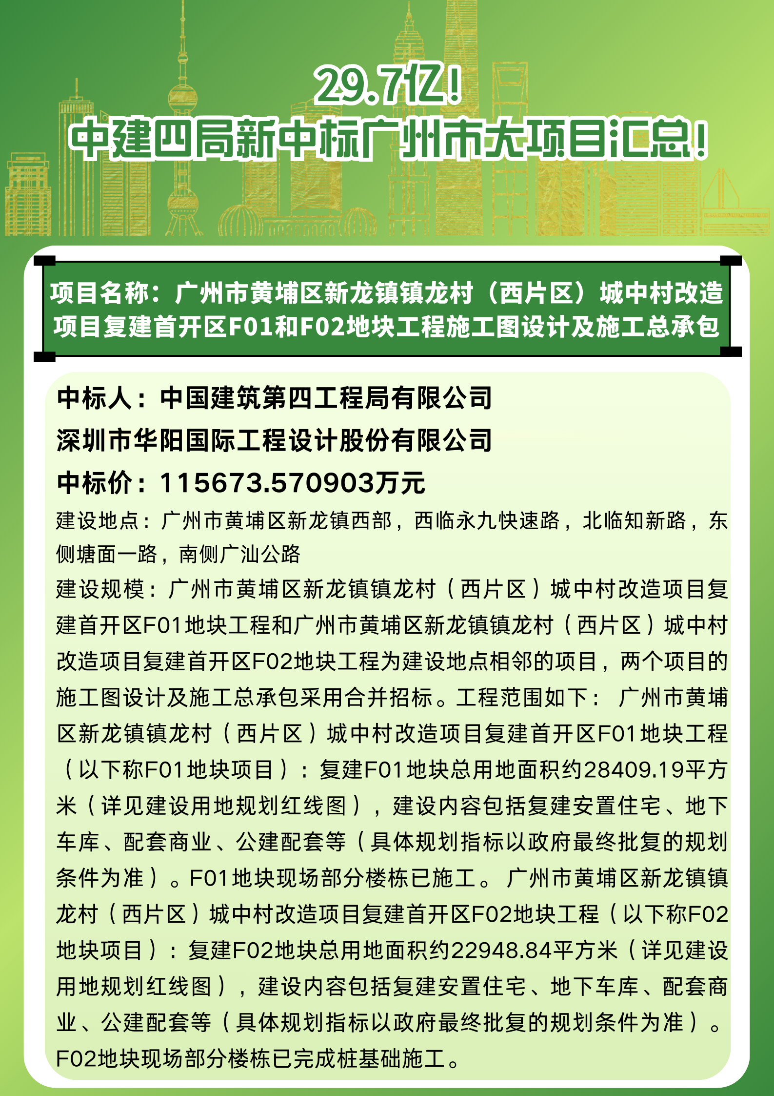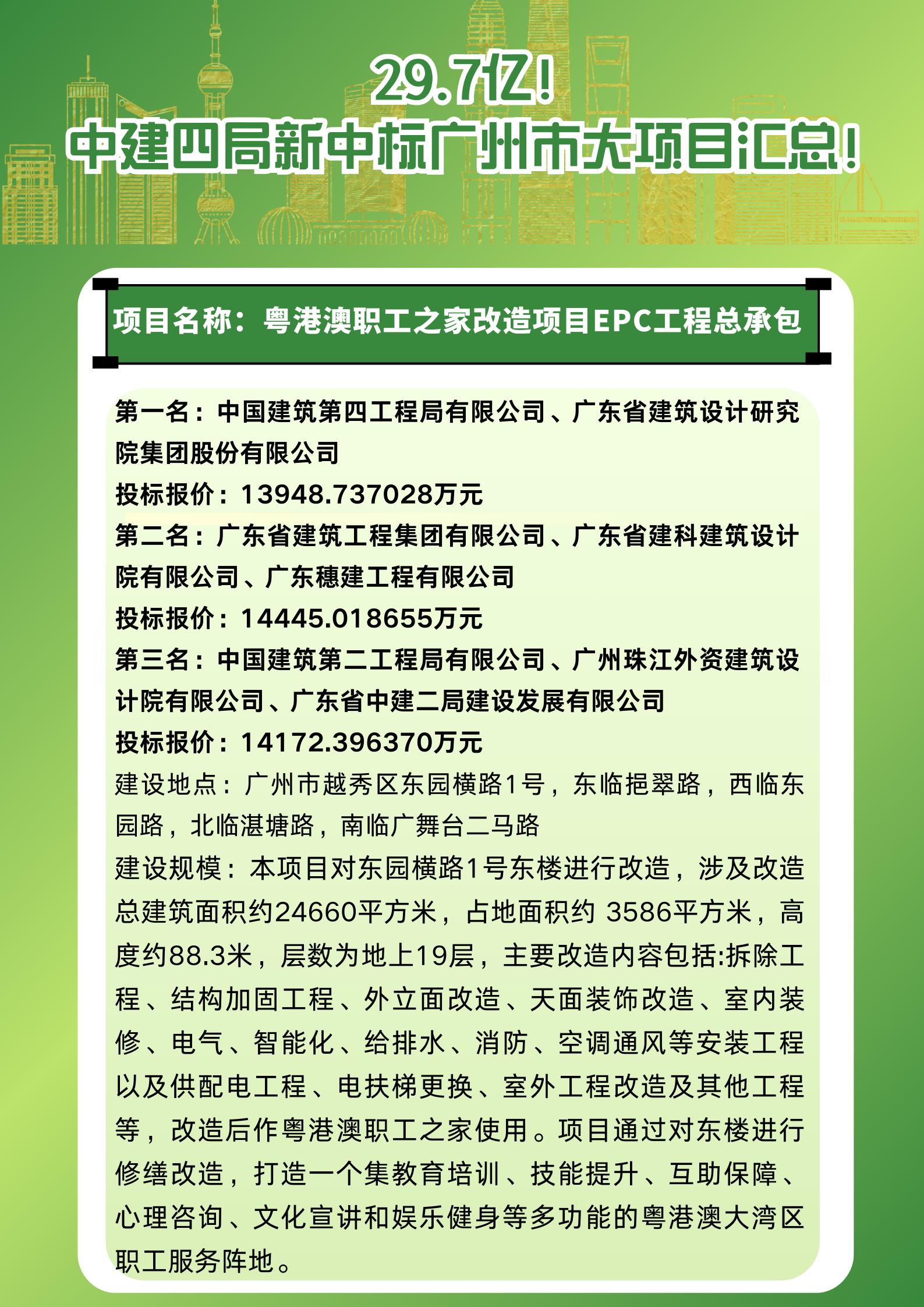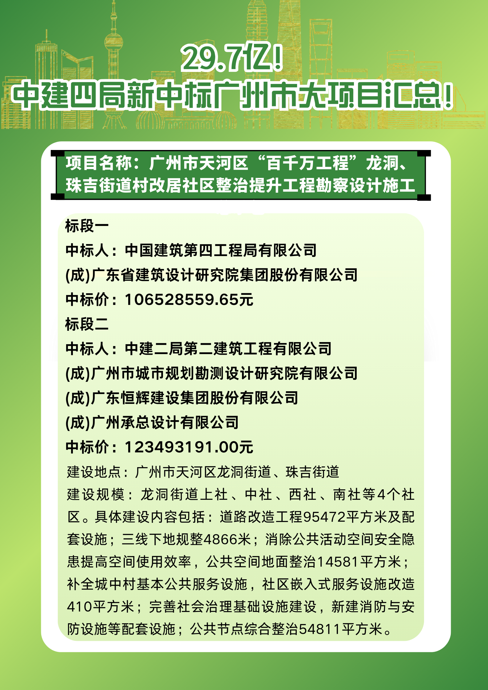 近日,中建四局新中标广州市大项目,29.7亿元!小编将详细中标信息整理成图片形式,便于各位同行们迅速查看