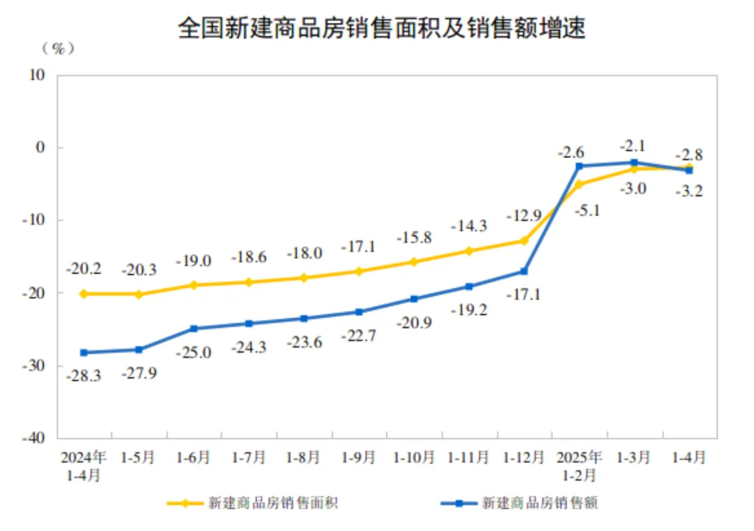 1-4月份,新建商品房销售面积28262万平方米,同比下降2.8%,降幅比1—3月份收窄0.2个百分点;其中住宅销售面积下降2.1%。新建商品房销售额27035亿元,下降3.2%;其中住宅销售额下降1.9%。