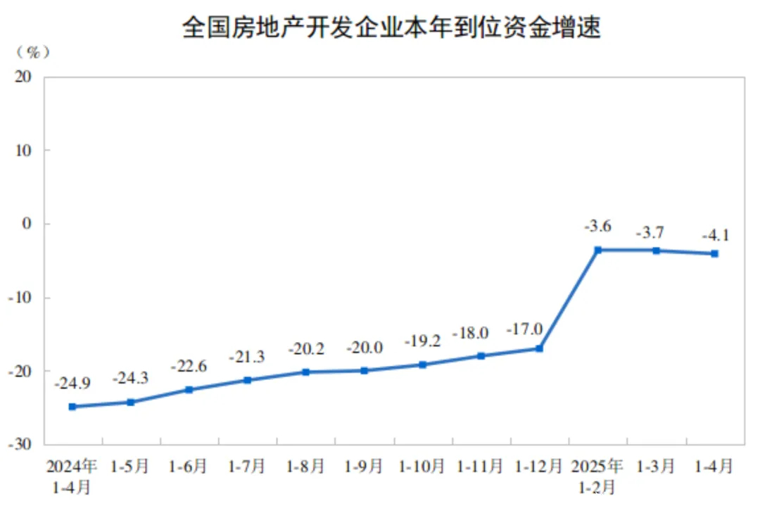 1-4月份,房地产开发企业到位资金32596亿元,同比下降4.1%。其中,国内贷款5619亿元,增长0.8%;利用外资16亿元,增长82.0%;自筹资金10953亿元,下降6.8%;定金及预收款9683亿元,下降3.0%;个人按揭贷款4518亿元,下降8.5%。
