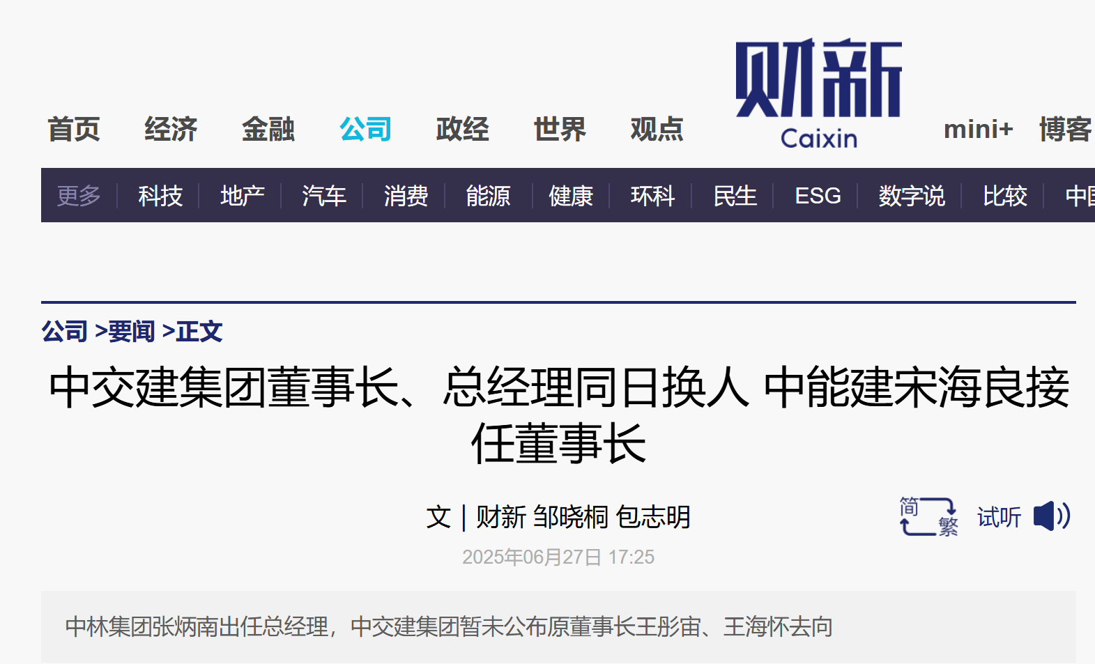 6 月 27 日,中国交通建设集团有限公司迎来重大人事调整,“一把手”、“二把手” 同日换人。原中国能源建设集团有限公司党委书记、董事长宋海良,出任中交集团党委书记、董事长;原中国林业集团有限公司党委副书记、董事、总经理张炳南,出任中交集团党委副书记、董事、总经理。