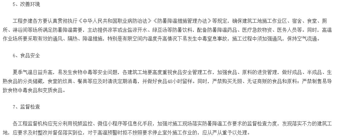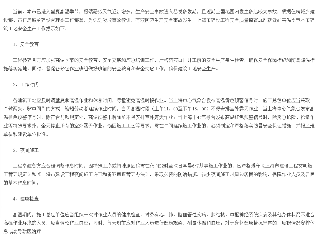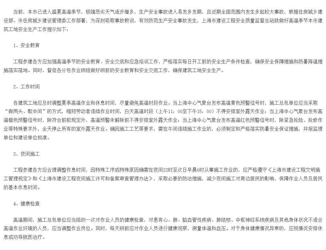 上海市住房和城乡建设管理委员有先见之明,早前便已发布了关于做好高温季节本市建筑工地安全生产的工作提示: