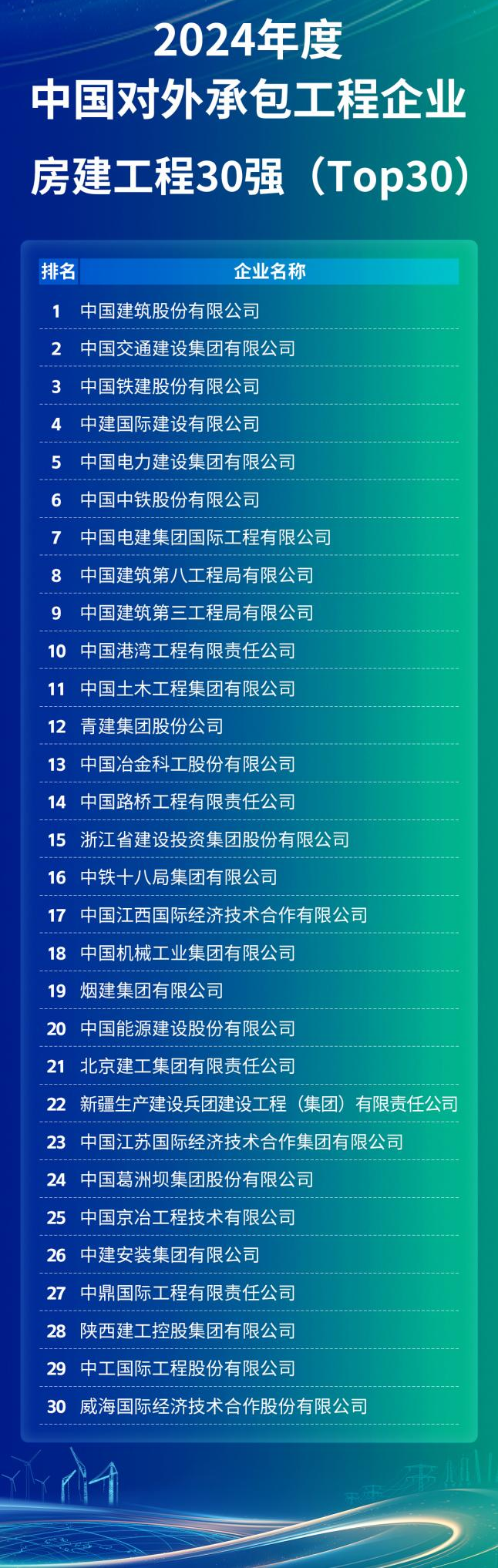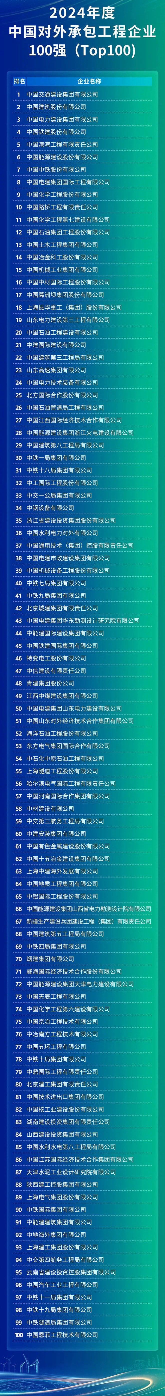 2025年4月24日,在对外承包工程行业发展大会期间,承包商会发布了2024年度中国对外承包工程百强企业名单(Top100)以及房建领域等区域市场30强(Top30)企业名单。