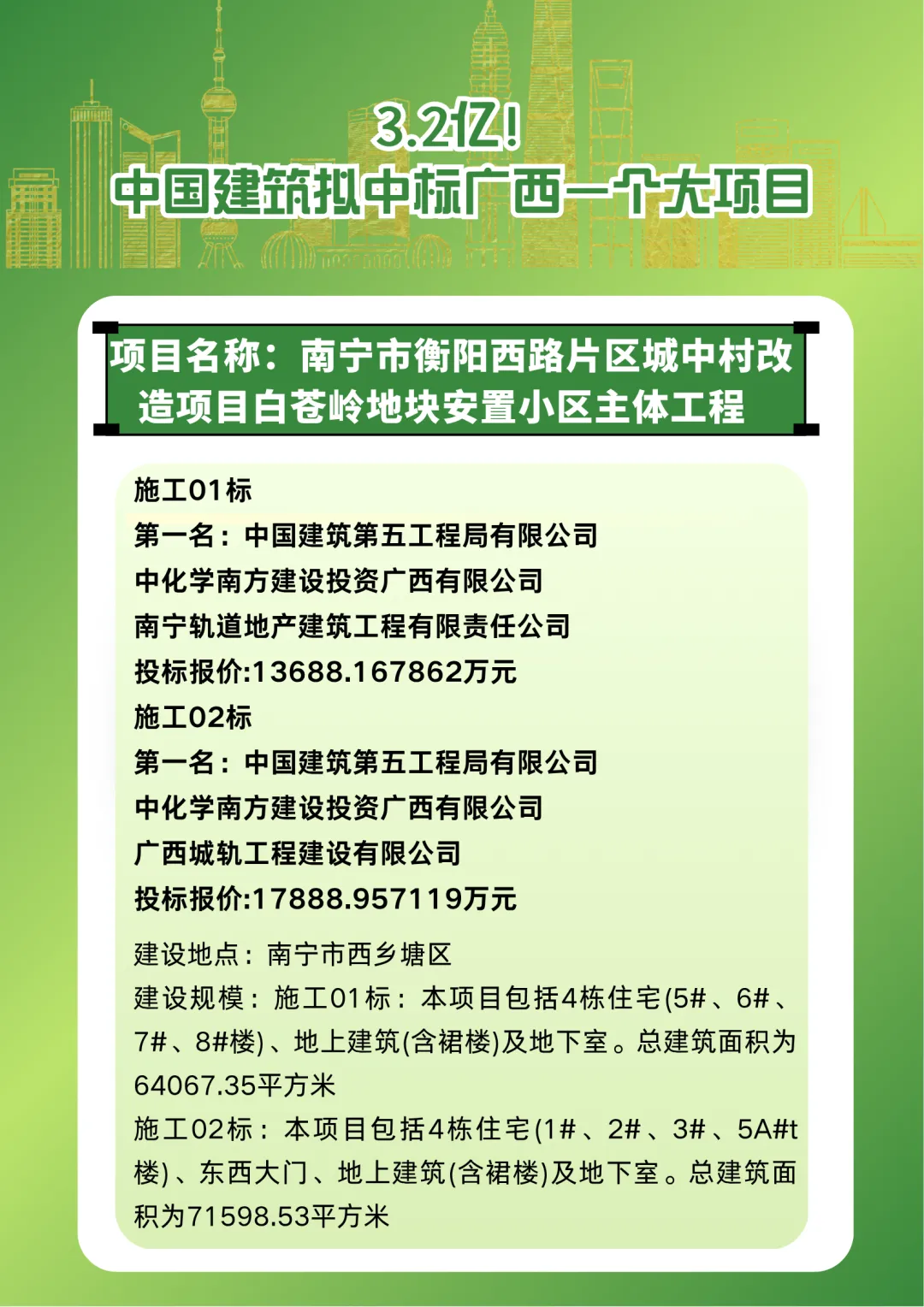近日,中国建筑拟中标广西一个大项目,3.2亿元!小编将详细中标信息整理成图片形式,便于各位同行们迅速查看。