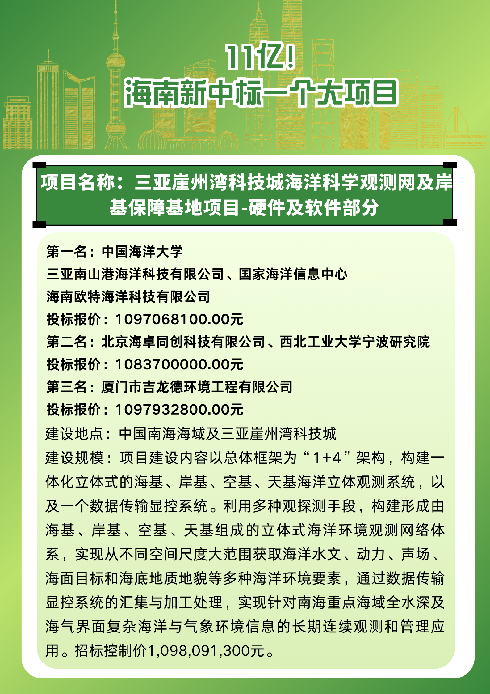 近日,海南新中标大项目11亿!小编将详细中标信息整理成图片形式,便于各位同行们迅速查看。 【免责声明】:筑木通发布的原创及转载内容,仅供客户参考,不作为决策建议。原创内容版权归筑木通所有,转载需取得筑木通书面授权,且筑木通保留对任何侵权行为和有悖原创内容原意的引用行为进行追究的权利。转载内容来源于网络,目的在于传递更多信息,方便学习与交流,并不代表筑木通赞同其观点及对其真实性、完整性负责。申请授权及投诉,请联系筑木通(400-6000-198)处理。