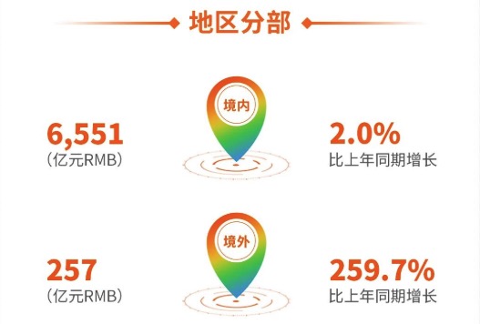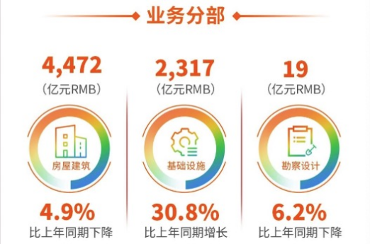 按照业务划分,房屋建筑业务新签合同额为4472亿元,比上年同期下降4.9%;基础设施业务新签合同额为2317亿元,比上年同期增长30.8%,勘察设计业务新签合同额为19亿元,比上年同期下降6.2%。按照地区划分,境内新签合同额为6551亿元,比上年同期增长2%;境外新签合同额为257亿元,比上年同期增长259.7%。